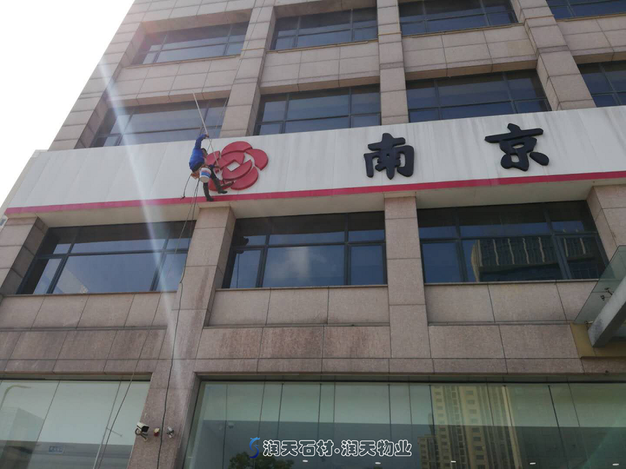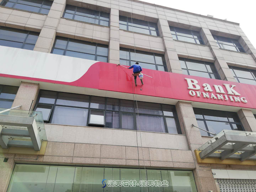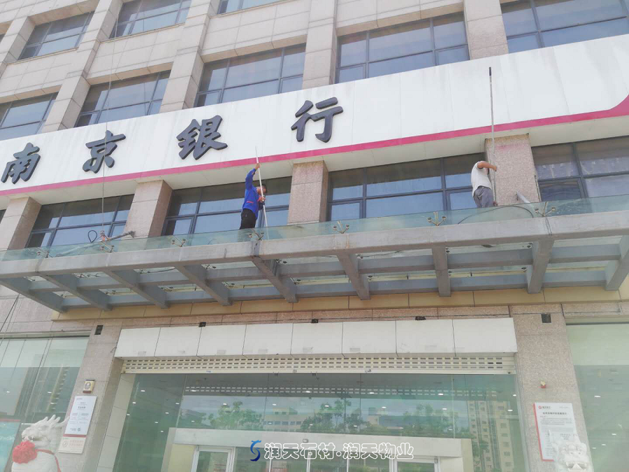簡訊:從地面到高空,不變的是我們的專業(yè)、仔細(xì)、全面與干凈!清洗南京銀行城南支行高空門牌和玻璃雨棚。-潤天物業(yè)