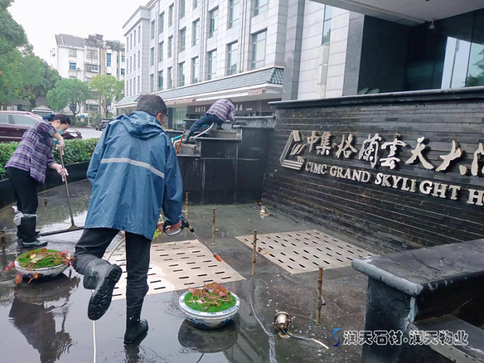 簡(jiǎn)訊:國(guó)慶假期前,揚(yáng)州潤(rùn)天物業(yè)駐格蘭云天酒店保潔冒雨清洗水池。-潤(rùn)天物業(yè)